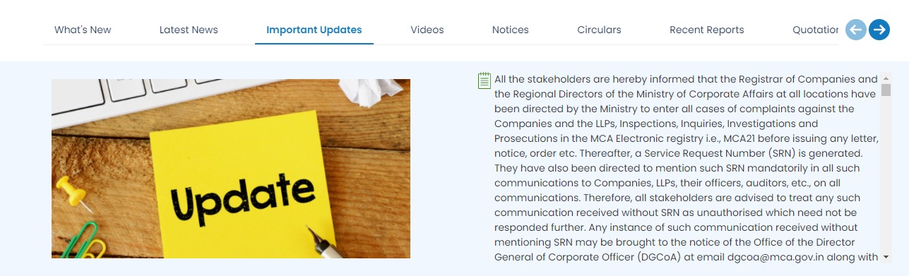 Any instance of such communication received without mentioning SRN may be brought to the notice of the Office of the Director General of Corporate Officer (DGCoA) at email dgcoa@mca.gov.in along with the copy of communication. Please find attached the screenshot below from the MCA website.